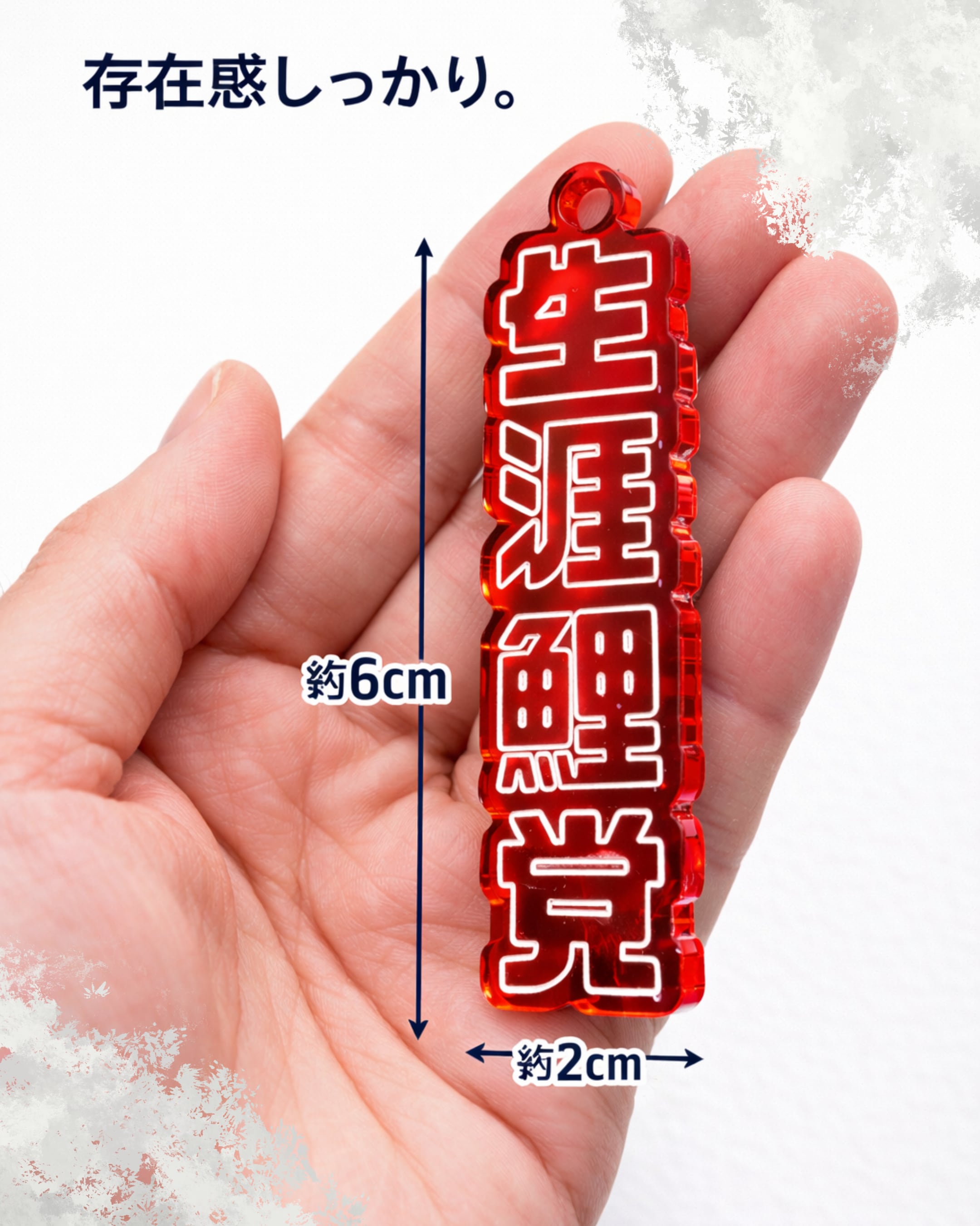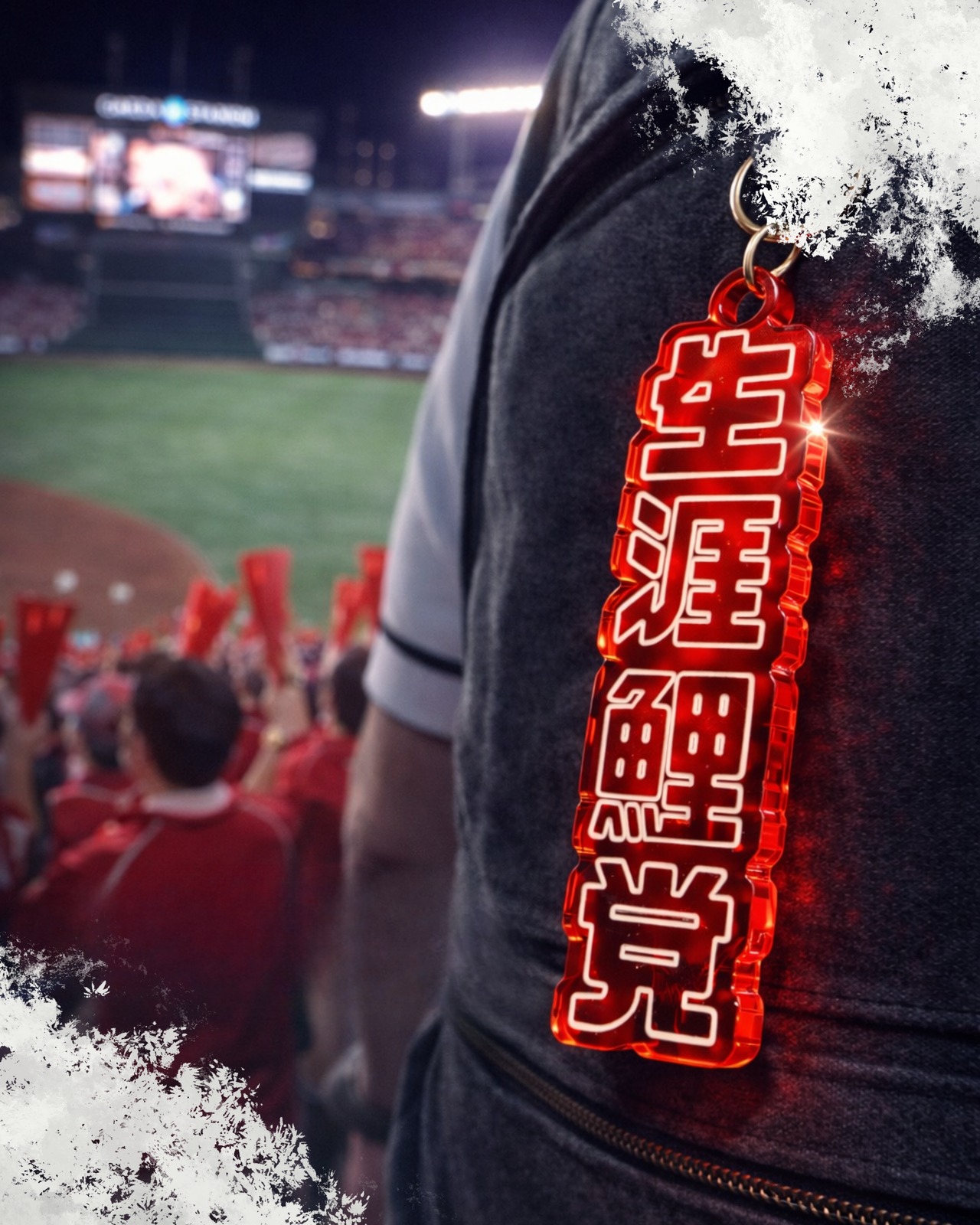 その土台に深く刻まれた「生涯鯉党」の四文字は、精巧な白の彫り加工。 単なるプリントではないため、立体感があり、長いシーズンを共に戦っても文字が消えにくいタフな仕様です。光を通すたびに真紅のアクリルが宝石のように煌めき、あなたの「鯉党としての揺るぎない覚悟」を美しく、力強く主張します。