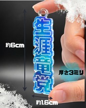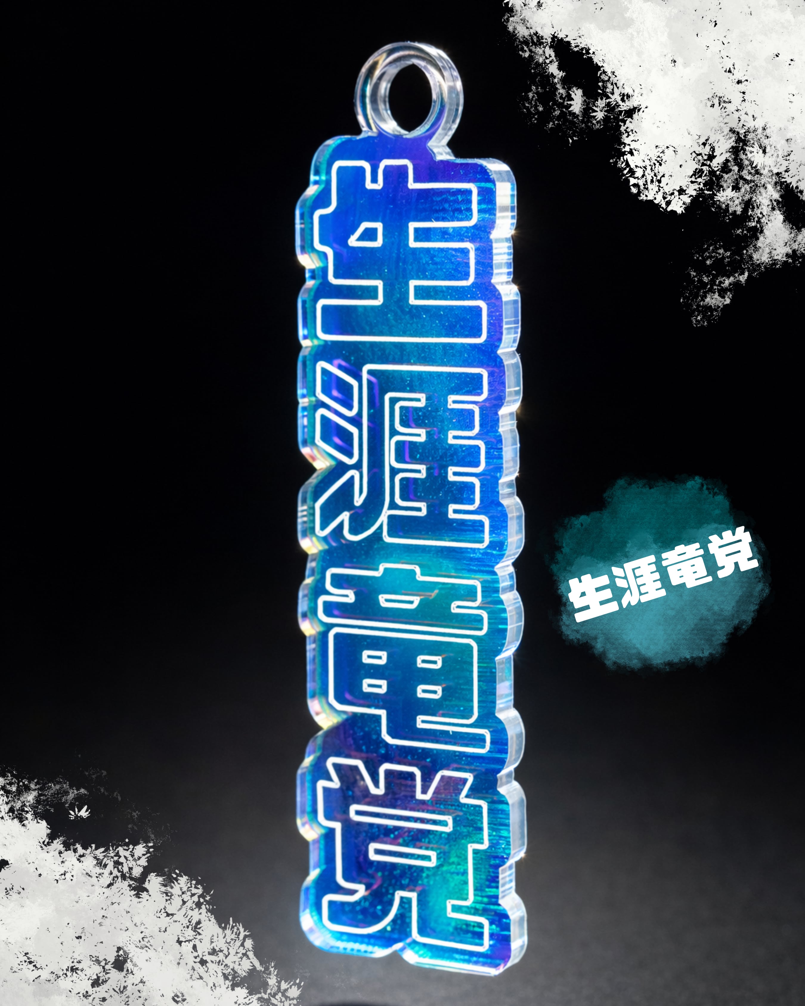 鏡面仕様のミラーアクリルに刻まれた「生涯竜党」の四文字は、精巧なレーザー彫刻によるもの。文字が内側から浮き上がって見えるような立体感があり、その存在感は圧倒的です。