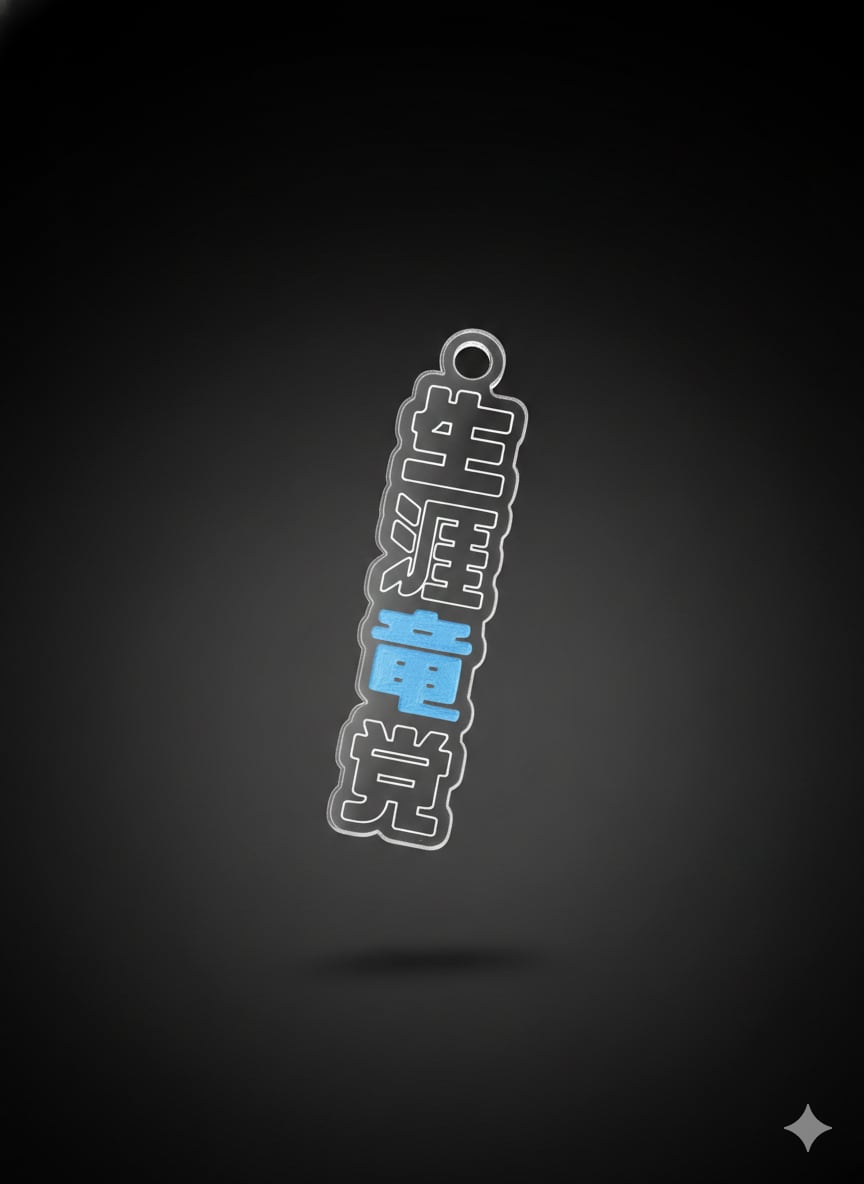 これは、私たちの心の中心には常に「竜」がいることを象徴しています。透明感あふれる高品質アクリルの中で、その青はまるで魂が宿ったかのように美しく輝きます。一目で「あ、この人は本物の竜党だ」と周囲に知らしめる、静かながらも強烈なインパクトを放つデザインに仕上げました。