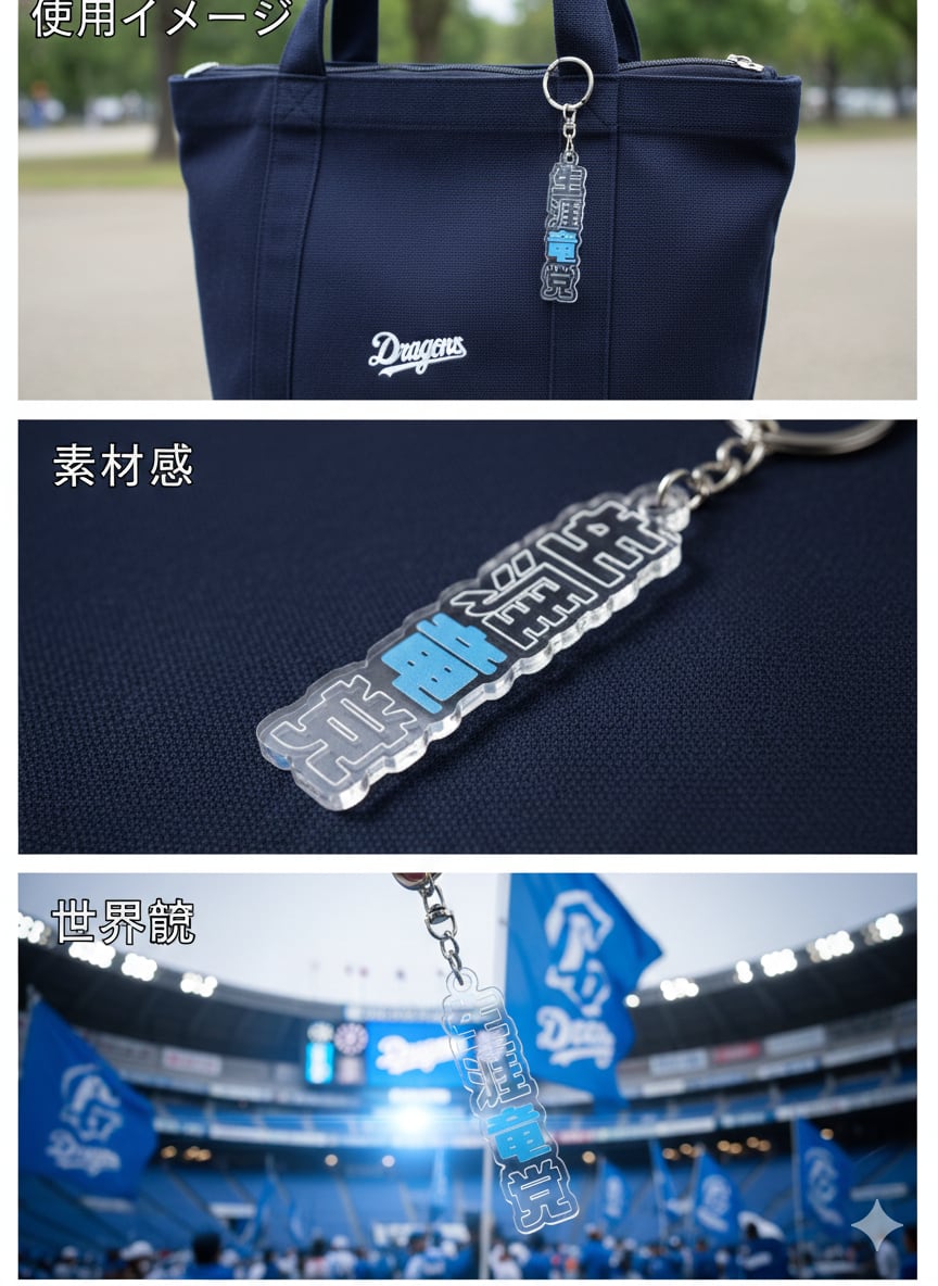 観戦バッグのアクセントに: お手持ちのトートバッグや応援リュックに装着すれば、一気に「戦闘服」へと格上げ。厚みのあるアクリルを使用しているため、スタジアムの喧騒の中でも確かな存在感を放ちます。