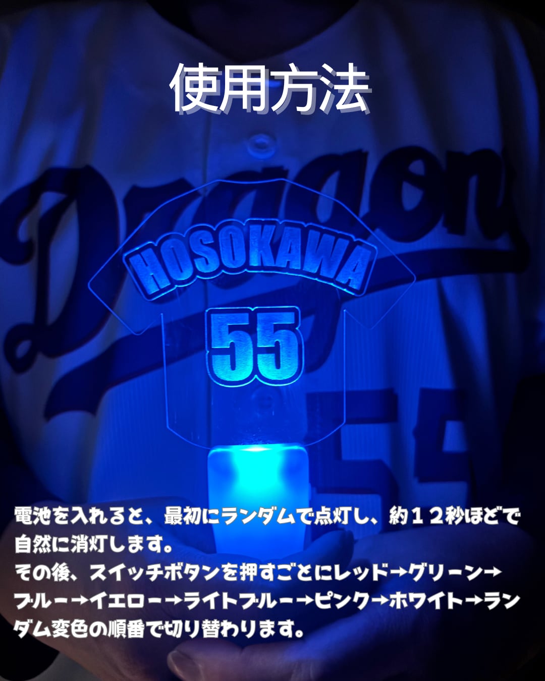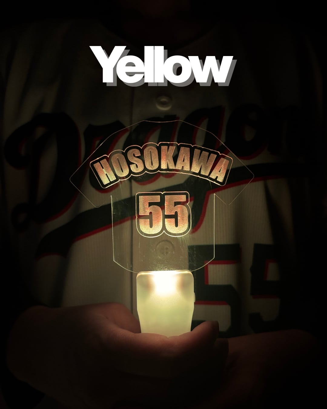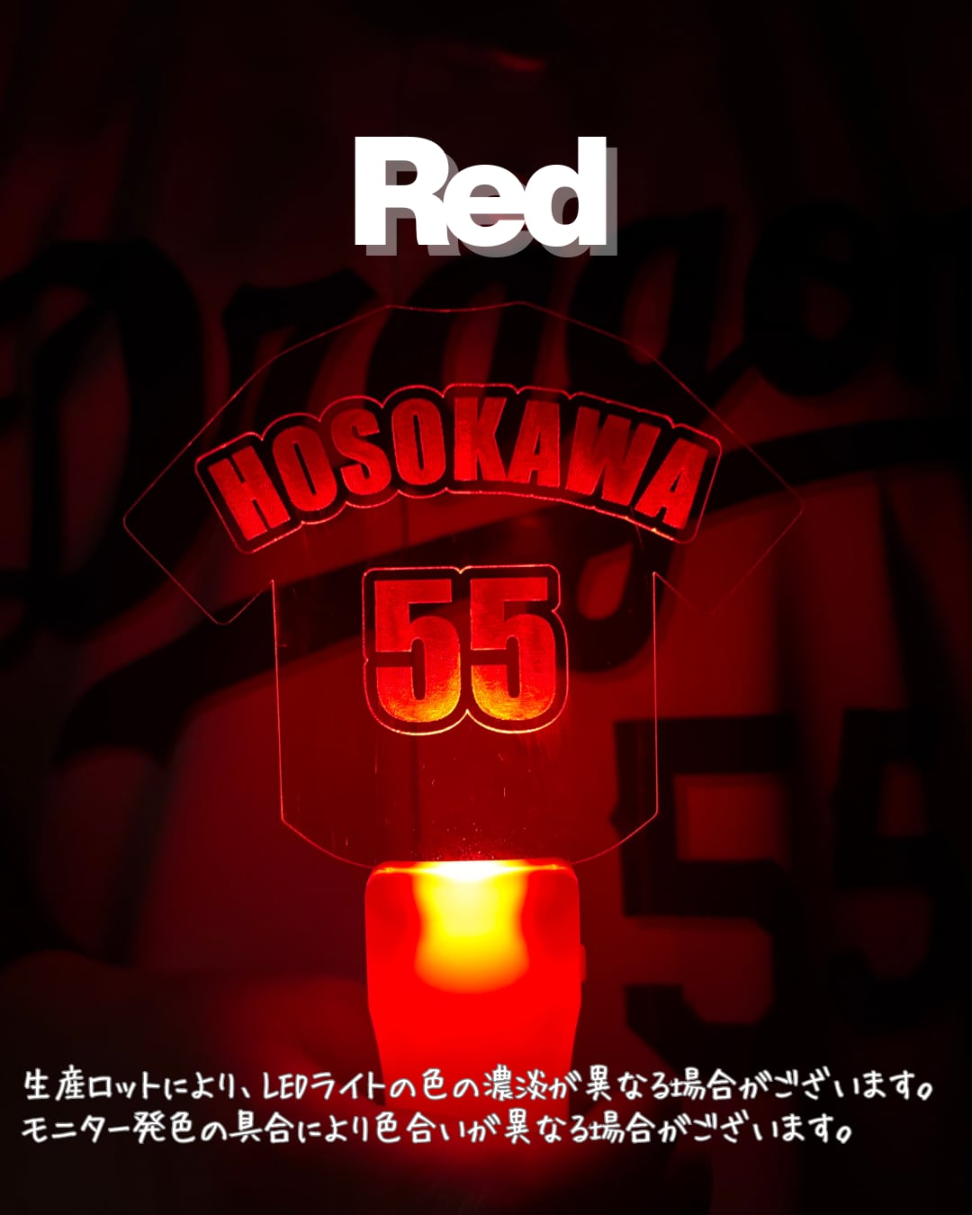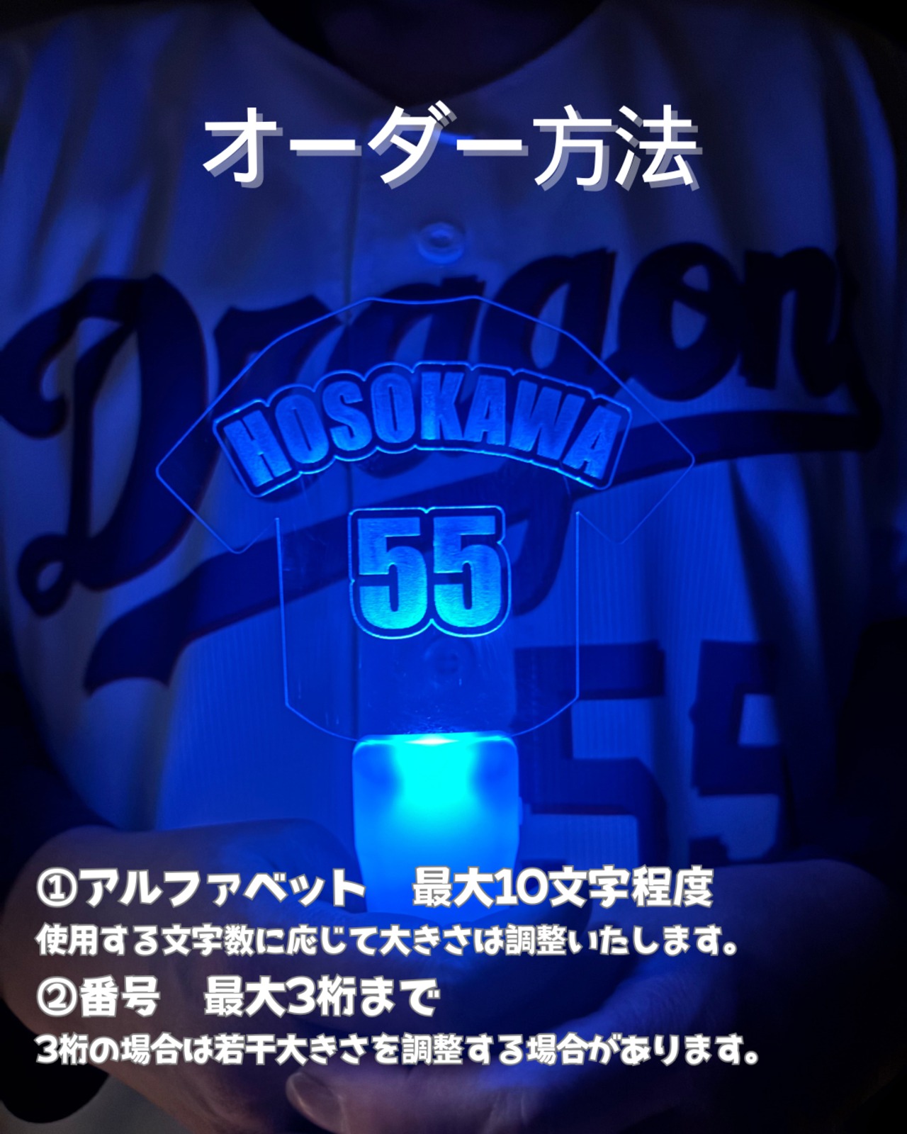 ・フルネーム刻印の圧倒的クオリティ英語ネームVer.のデザインは、まるでユニフォームがそのまま光り輝いているような高級感。アクリル板の端まで光が回る設計なので、遠くのグラウンドからも視認性抜群です。