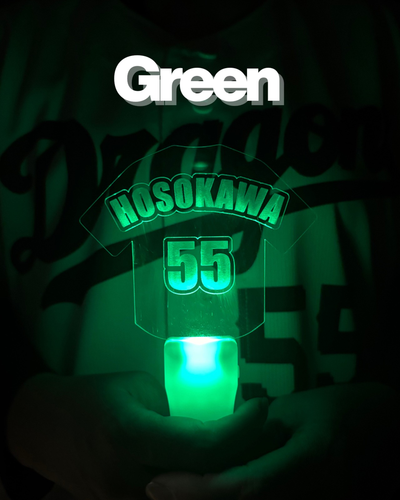 このスタジアムライトは、好きな選手の名前と背番号を自由に刻印できる完全オーダー制。レーザー刻印によって浮かび上がる文字は、LEDの光をエッジまで余すことなく反射し、暗闇の中で驚くほどくっきりと、そして幻想的に輝きます。